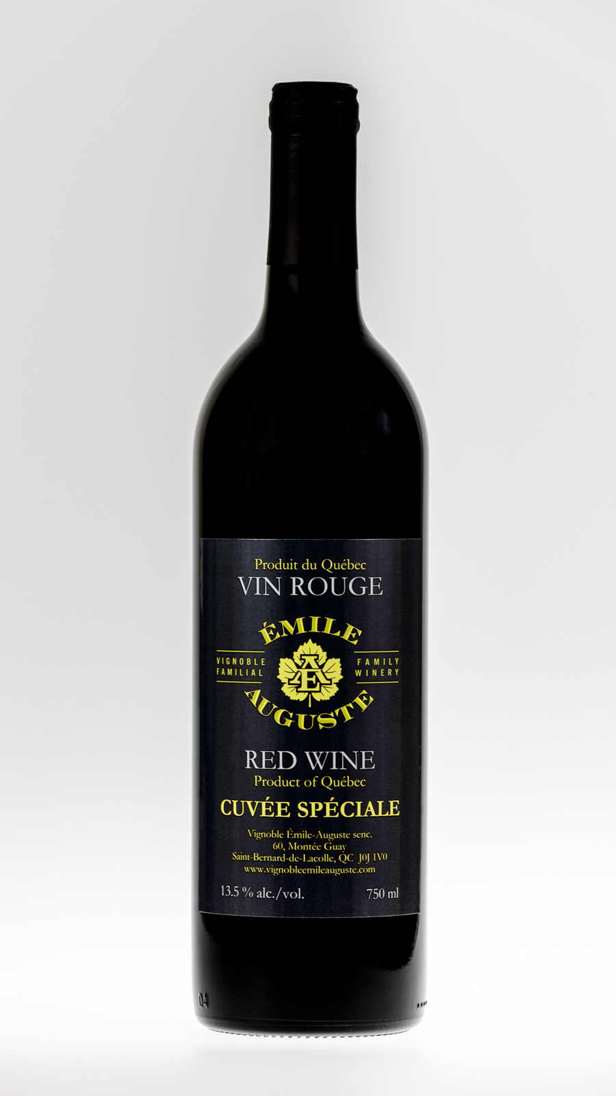 CUVÉE SPÉCIALE 2013-2014 – Vin rouge complet en soi de couleur intense. Arômes de petits fruits rouges, cerise, violette. Rond en bouche. Monocépage: Petite Perle. Accompagne très bien un repas copieux, lors du service de viande rouge. Servir entre 14° et 16° C. Sucres réducteurs 4.3g/l. Contient des sulfites. – PRIX: 18,00$