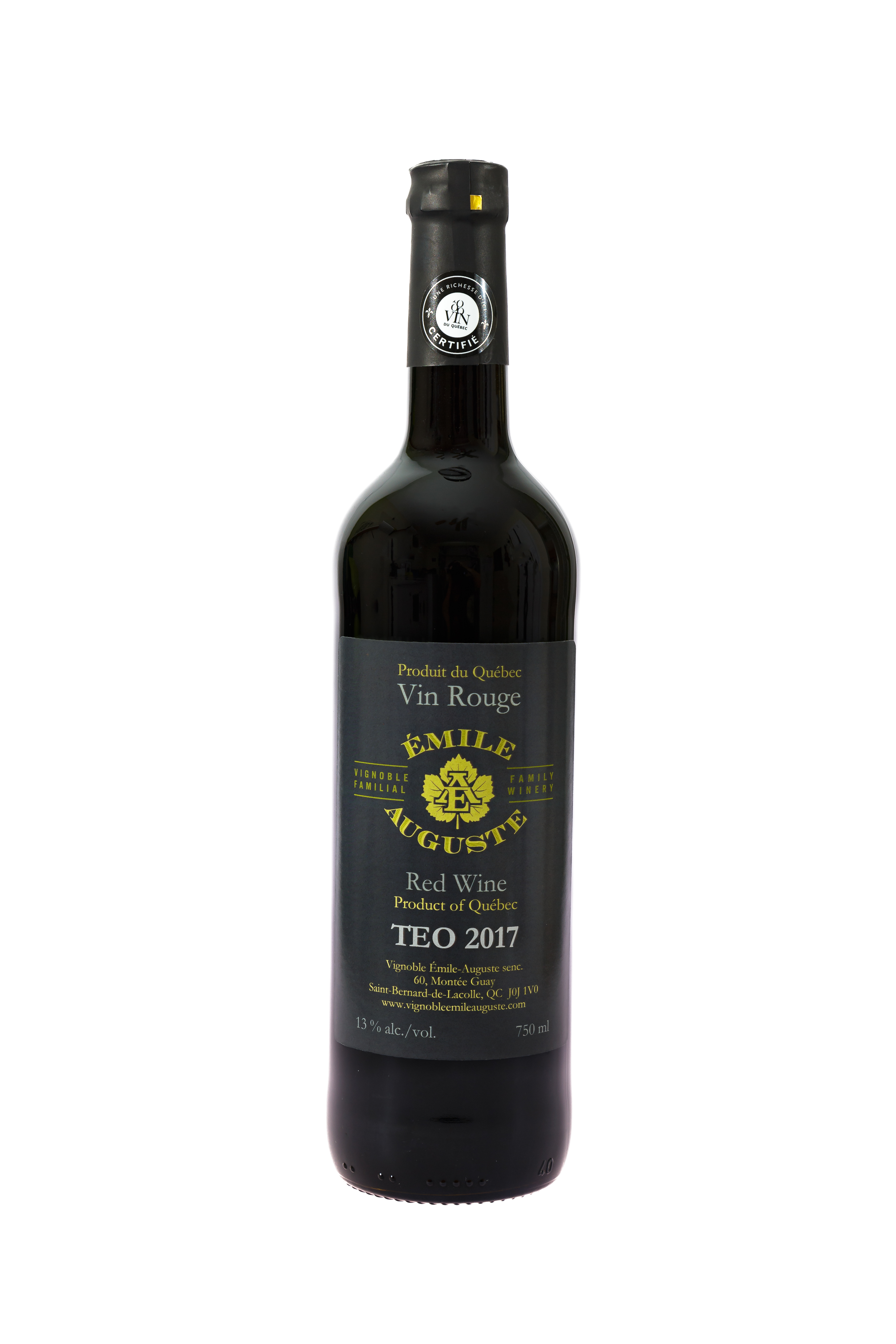 TEO 2017 – Vin rouge mi-corsé. Assemblage de nos différents cépages: St.Croix, Marquette, Petite Perle, Frontenac Rouge, Sabrevois et Radisson. Robe de couleur rubis clair s’affirmant par des saveurs de fleurs et de fruits rouges. Accompagne très bien un bon repas à base de viandes rouges ou de pâtes. Servir entre 14° et 16° C. Sucres réducteurs 2.4 g/l.