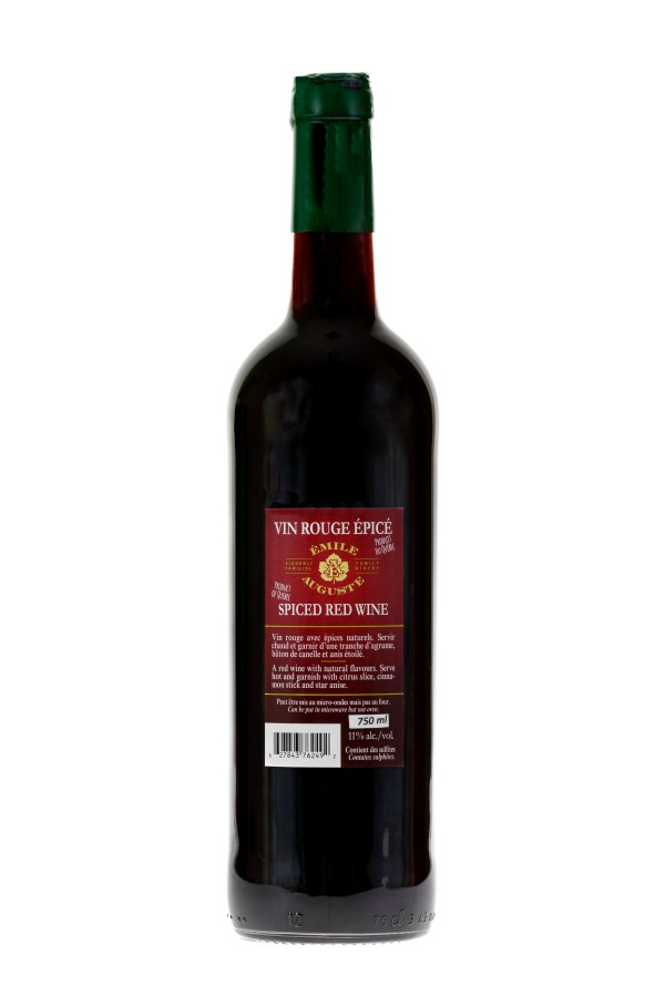 VIN ROUGE ÉPICÉ. Vin rouge avec épices naturels. Servir chaud et garnir d’une tranche d’agrume, d’un bâton de cannelle et d’un anis étoilé. 11% alc./vol. PRIX: 25$