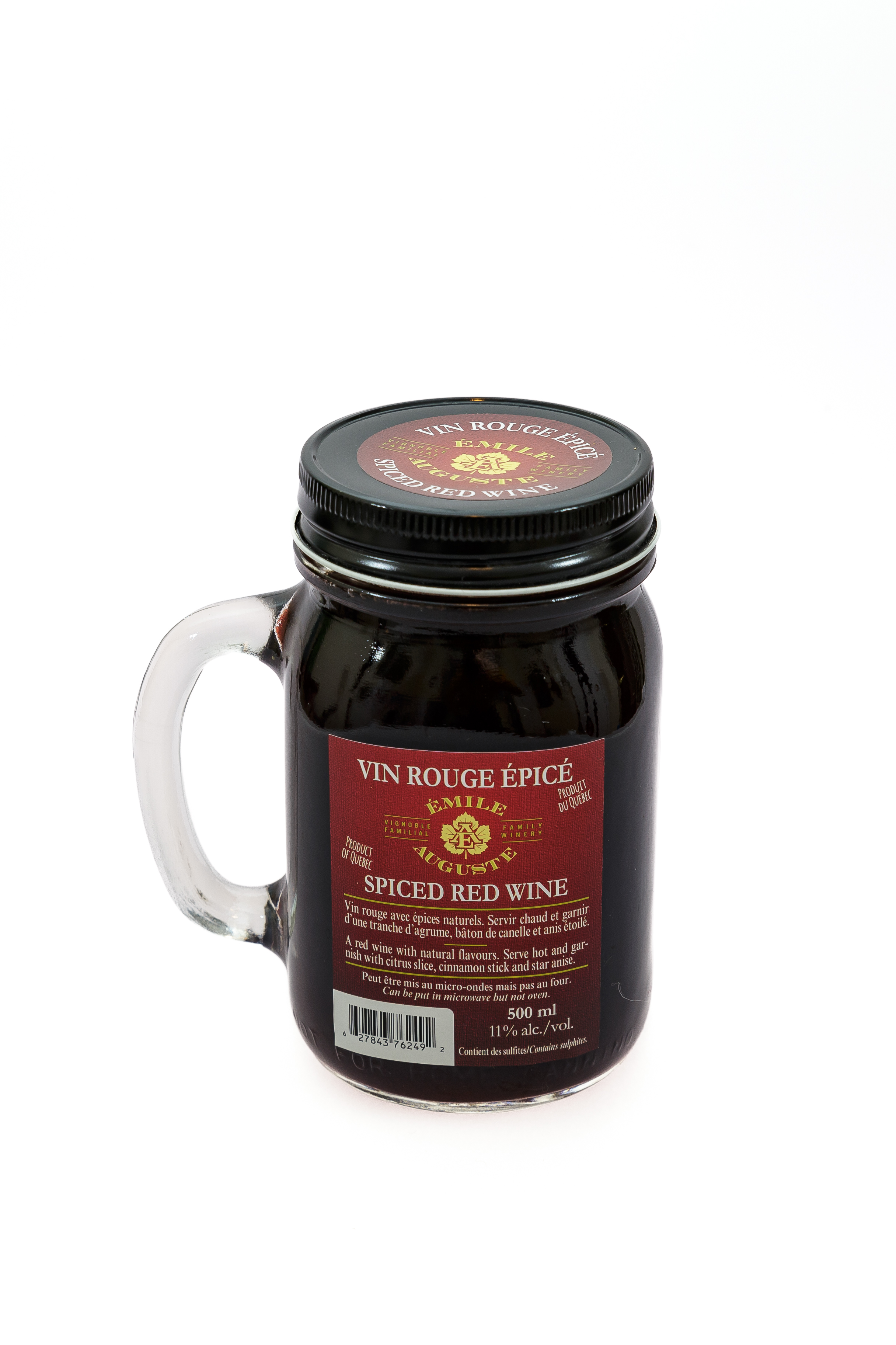 VIN ROUGE ÉPICÉ. Vin rouge avec épices naturels. Servir chaud et garnir d’une tranche d’agrume, d’un bâton de cannelle et d’un anis étoilé. 11% alc./vol. Pot de 500 ml. – PRIX: 15$
